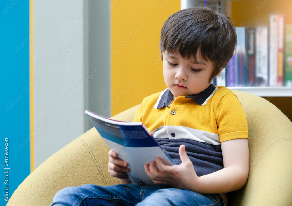 Portrait of unhappy kid sitting alone looking at the book with bored face in library, Upset chile boy with sad face with deep through sitting alone in book shop, Little boy with bored face