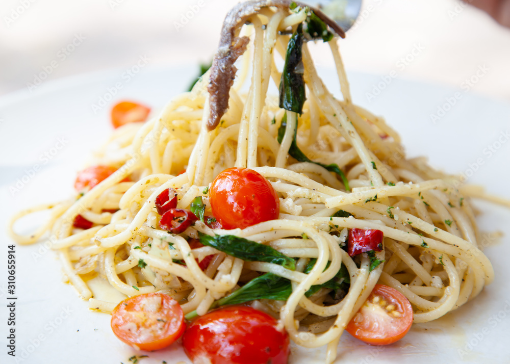 Spaghetti with anchovy, cherry tomato, onion, chili and pamersan cheese