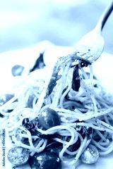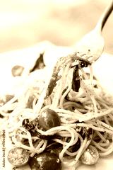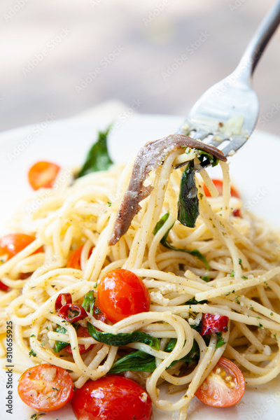 Spaghetti with anchovy, cherry tomato, onion, chili and pamersan cheese
