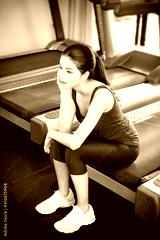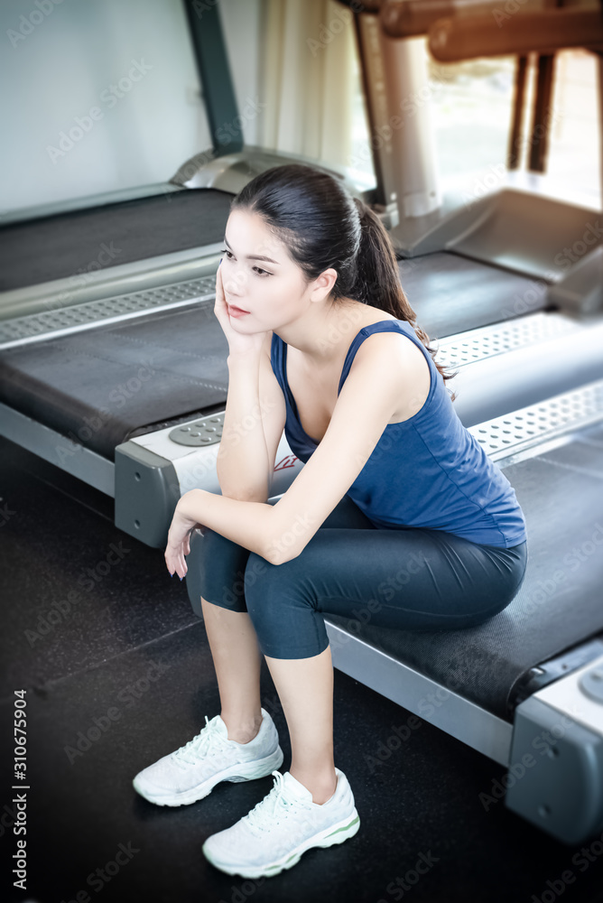 The beautiful woman sitting on electric treadmill,tried feeling,after finished exercise,at fitness center,blurry light around