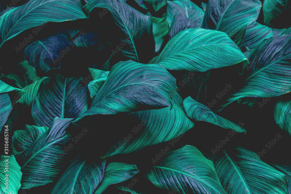 leaves of Spathiphyllum cannifolium, abstract green texture, nature background, tropical leaf