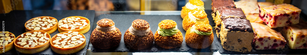 Showcase with cakes, shortbread cookies and pieces of cake. Sweets on a black board in the fridge. Unusual size