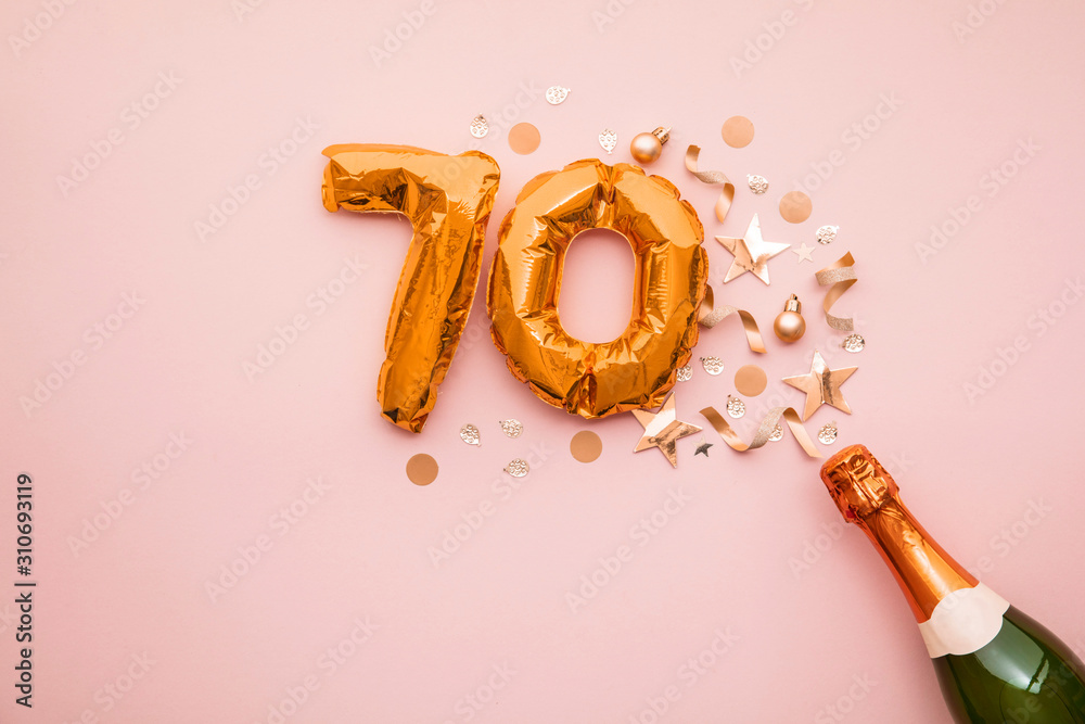 Happy 70th anniversary party. Champagne bottle with gold number balloon.