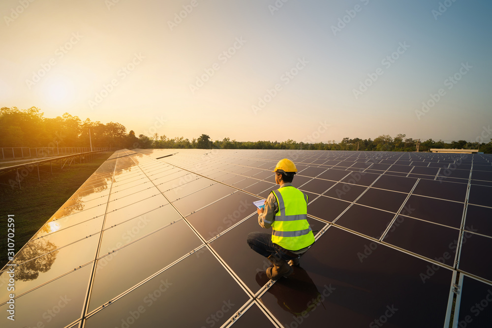 Portrait of engineer man or worker, people, with solar panels or solar cells on the roof in farm. Power plant with green field, renewable energy source in Thailand. Eco technology for electric power.