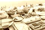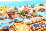 Breakfast on the beach at hotel or resort by the sea in summer season. Holiday and vacation breakfast image.Traditional Turkish or Greek breakfast at bodrum town beach in Turkey or Greece