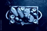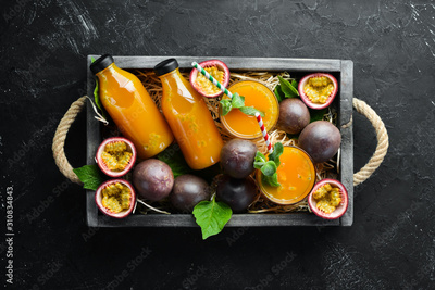 Passion fruits juice and fruit on a black background. Tropical Fruits. Top view. Free space for text.