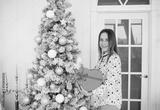 Young smiling woman with red heart candy box in hands.