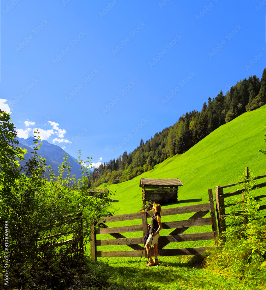 Beautiful mountain panorama in the "Stubai Valley" Austria with young woman