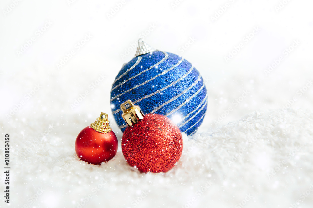 Christmas red and blue balls on abstract background Beautiful Christmas bauble decorations lie on the white fluffy snow. Atmosphere of magic and fairy tales