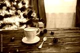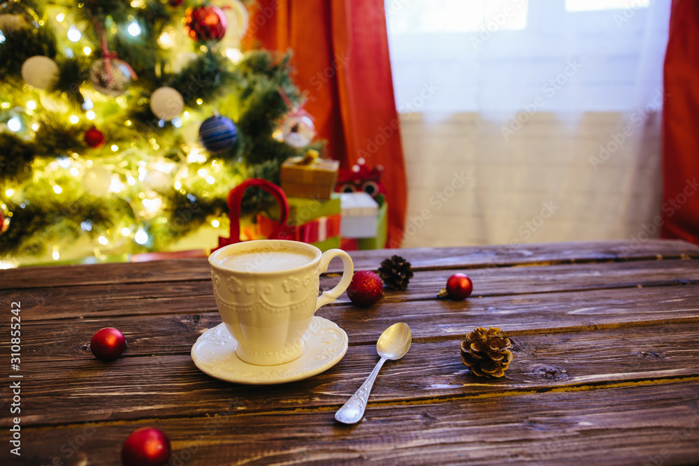 Mug with hot chocolate on a wooden table with Christmas decorations on a background of the Christmas tree