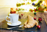 Mug with hot chocolate on a wooden table with Christmas decorations on a background of the Christmas tree