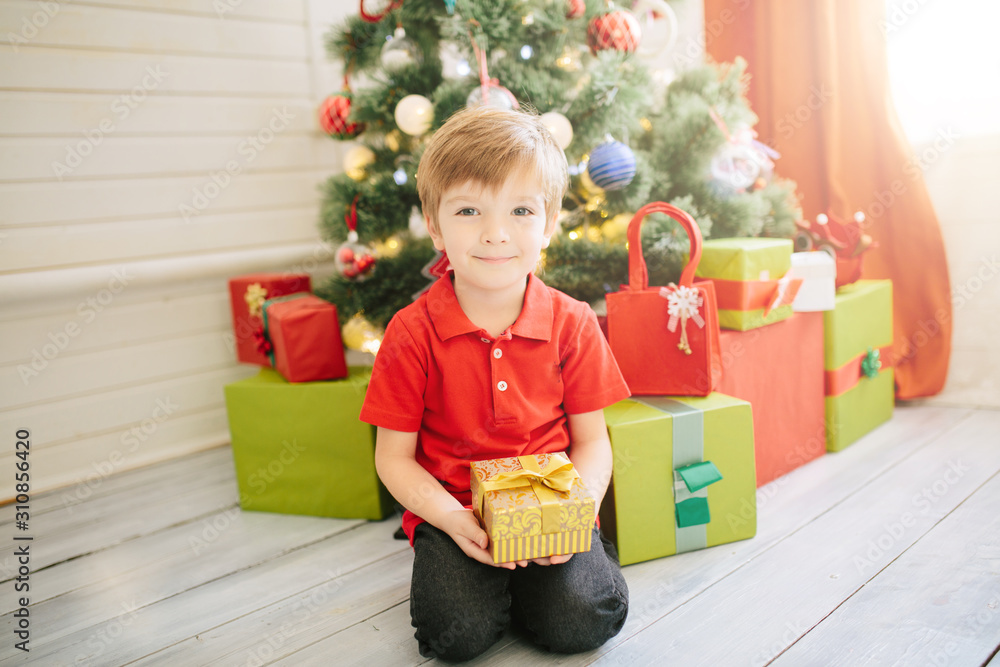 Cute little boy of about five year with a gift in a decorated Christmas room with a xmas tree.