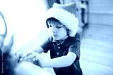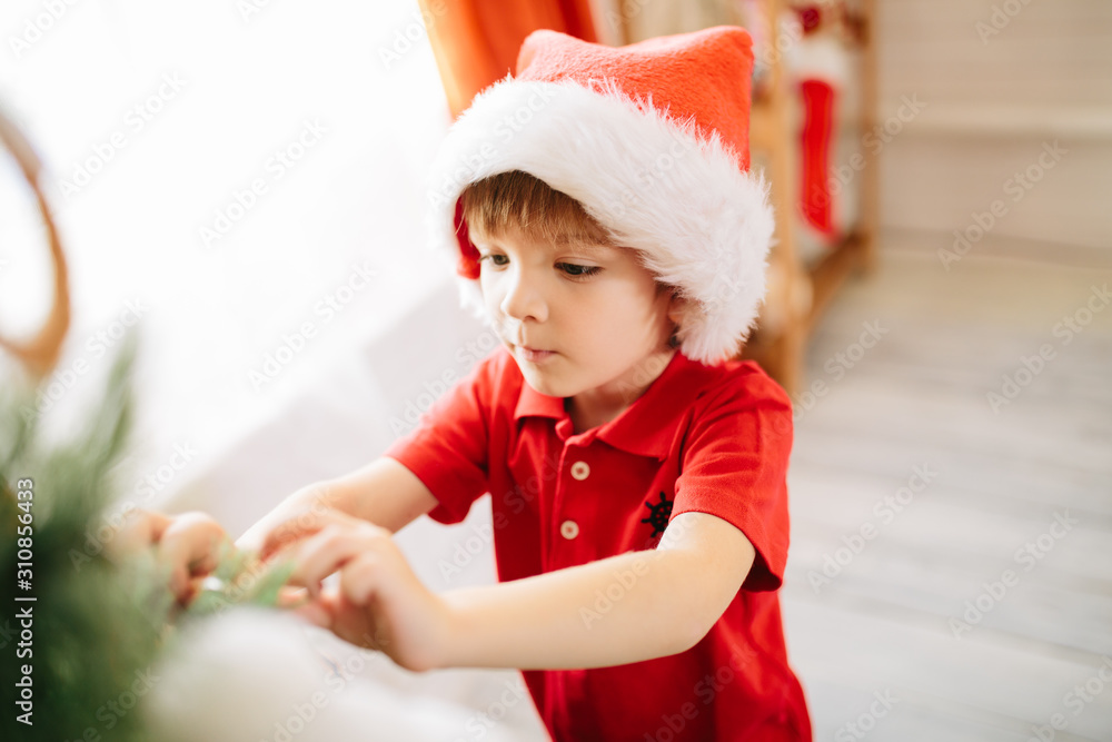 Cute little boy of about five year with blue eyes decorating a Christmas tree.