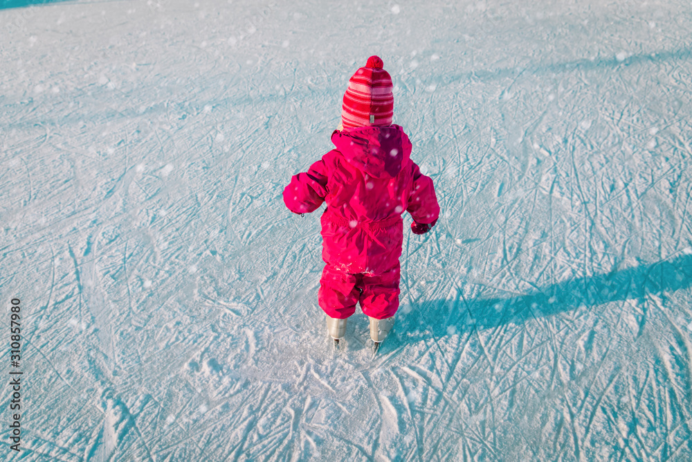 little girl learning to skate on ice in winter snow