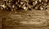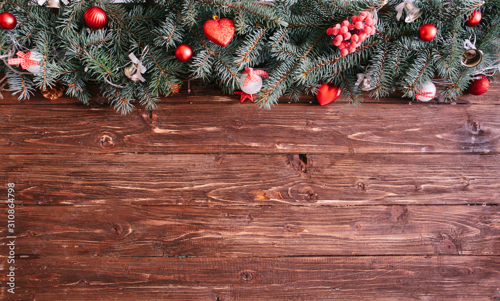 Christmas tree branch and lights on wooden background. View with copy space Blurred Christmas background, with fir branches, fairy lights and christmas decorations on brown wooden plank