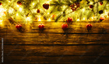 Christmas fir tree with decoration on a wooden board Blurred Christmas background, with fir branches, fairy lights and christmas decorations on brown wooden plank