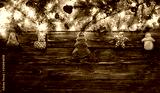 Border art design with Christmas tree, baubles and light garland Blurred Christmas background, with fir branches, fairy lights and christmas decorations on brown wooden plank