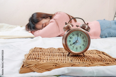 Vintage Alam clock show time for Teen girl reading book on bed room.