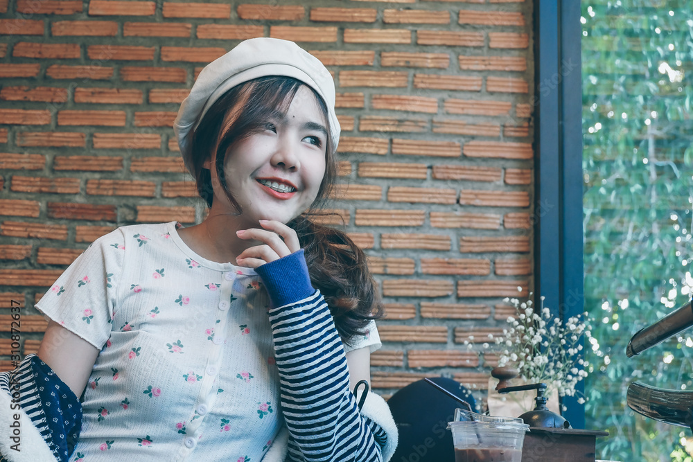 Young woman sitting in coffee shop at wooden table.