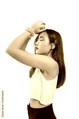 Teen girl feel headache action on white background.