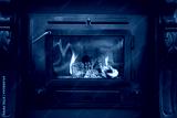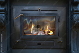 Tradional black Wood Burning Stove close-up with fire flames, antique design cozy