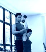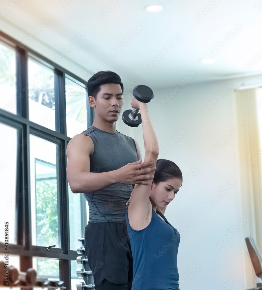 The trainer teaching beautiful woman for use dumbbell,exercise program,at fitness center