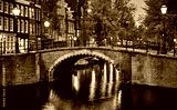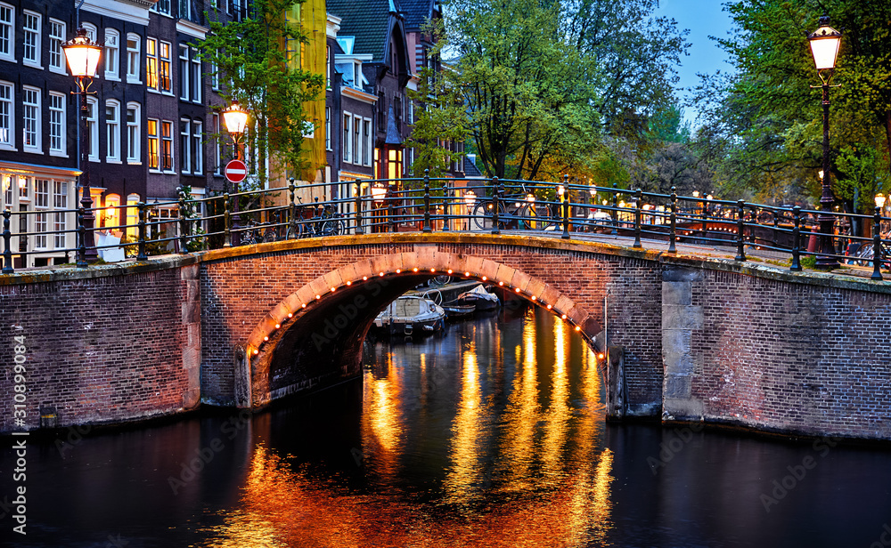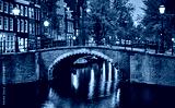 Amsterdam, Netherlands. Bridges with nighttime illumination over canals with water in Old town. Quarter with traditional dutch houses. Vertical evening landscape. Blue hour.