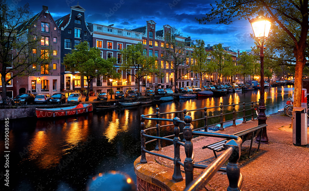 Evening town Amsterdam in Netherlands on bank river canal Amstel with shining window. Panorama landscape brown house over water reflection.
