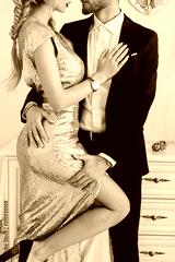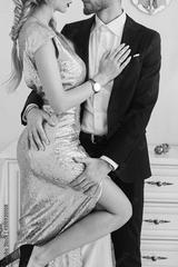 Young fashionable couple, handsome man holding hands on the hips of beautiful woman with perfect body in a gold dress. Young businessman dancing dirty dance with sexy model girl in gold dress