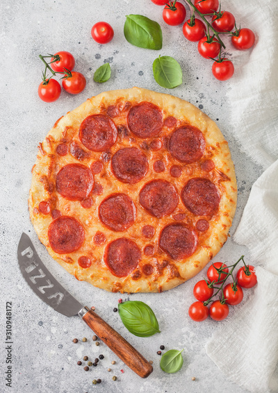 Fresh round baked Pepperoni italian pizza with knife with tomatoes and basil on light background with linen towel. Top view