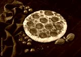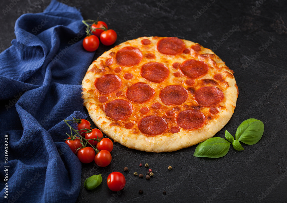 Fresh round baked Pepperoni italian pizza with tomatoes with basil on black background with blue linen towel.