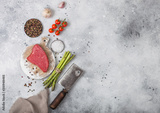 Slice of Raw Beef sirlion steak on round chopping board with tomatoes,garlic and asparagus tips and meat hatchet. Space for text