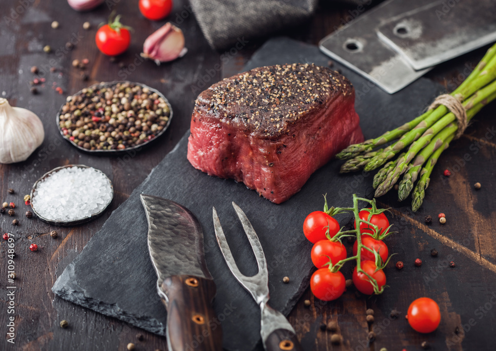 Slice of Raw Beef Topside Joint with Salt and Pepper on stone chopping board with fork and knife, garlic and asparagus tips and tomatoes.