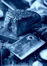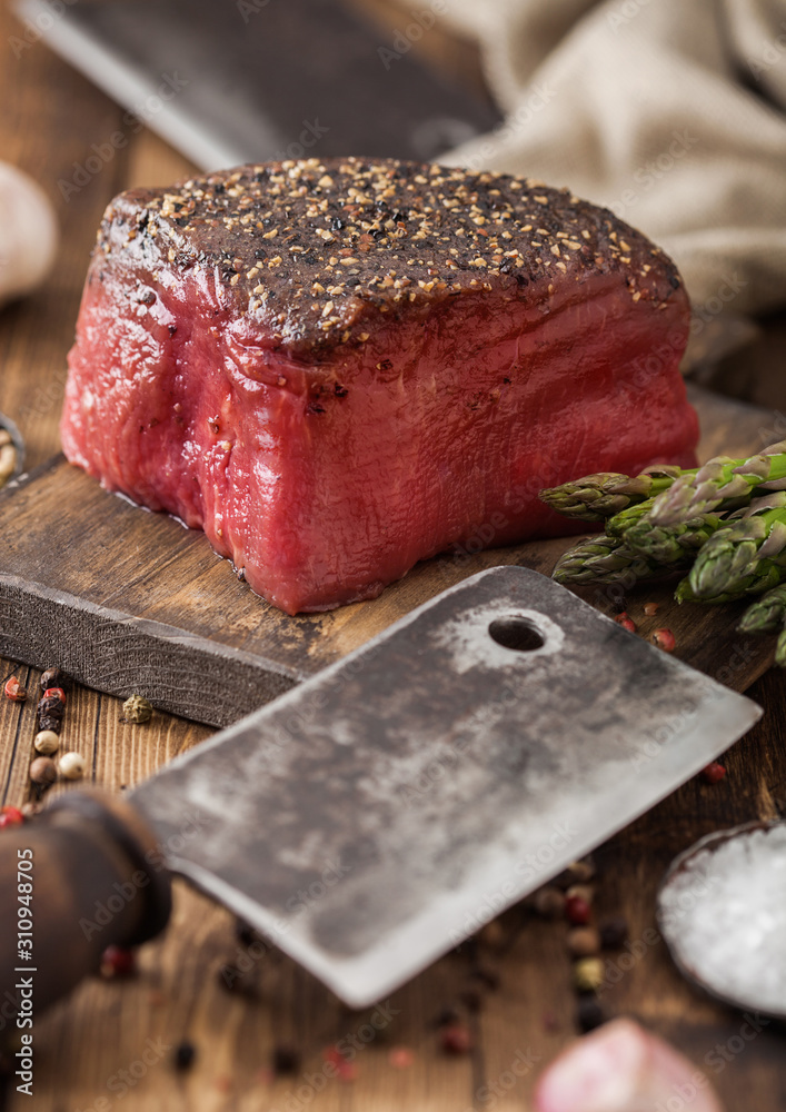 Slice of Raw Beef Topside Joint with Salt and Pepper on wooden chopping board with meat hatchet, garlic and asparagus tips.