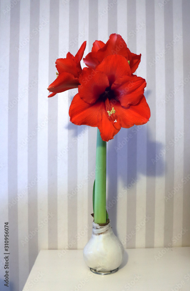 Amaryllus flower diped with wax and striped wallpaper in the background.