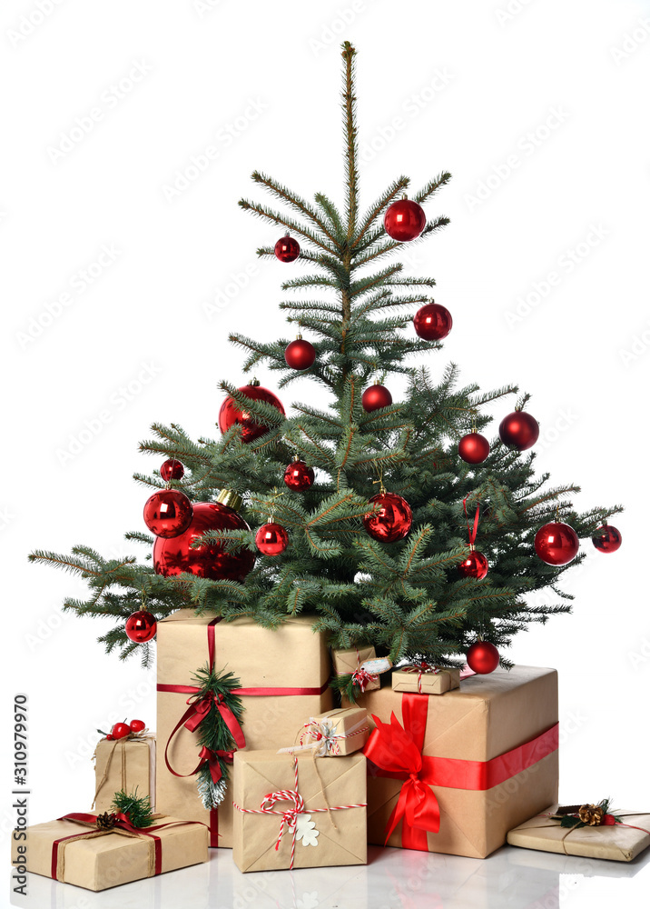 Christmas tree decorated with red patchwork ornament balls and craft presents gifts for new year xmas