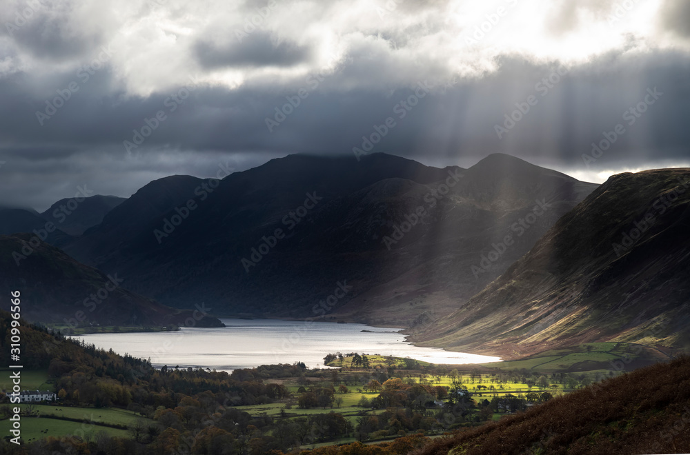 Majestic sun beams light up Crummock Water in epic Autumn Fall landscape image with Mellbreak and Grasmoor