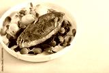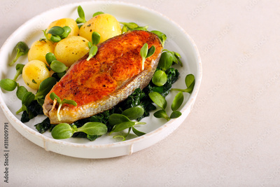 Fried salmon over spinach and potatoes