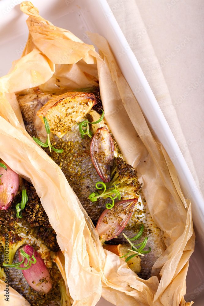 Whole baked sea bass fish