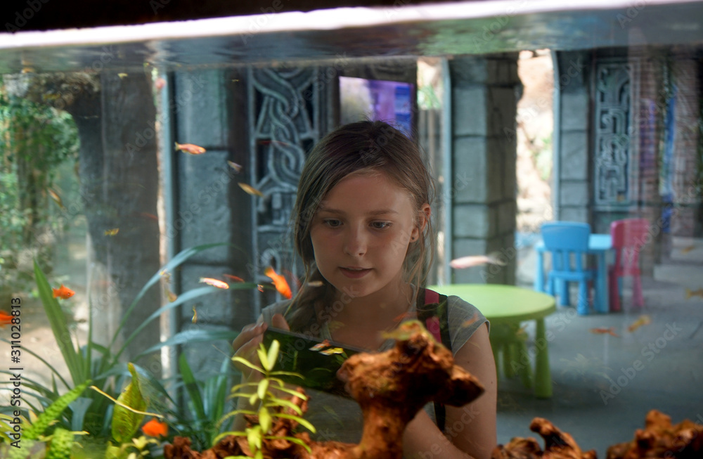on a trip to the zoo, a child photographs fish in an aquarium
