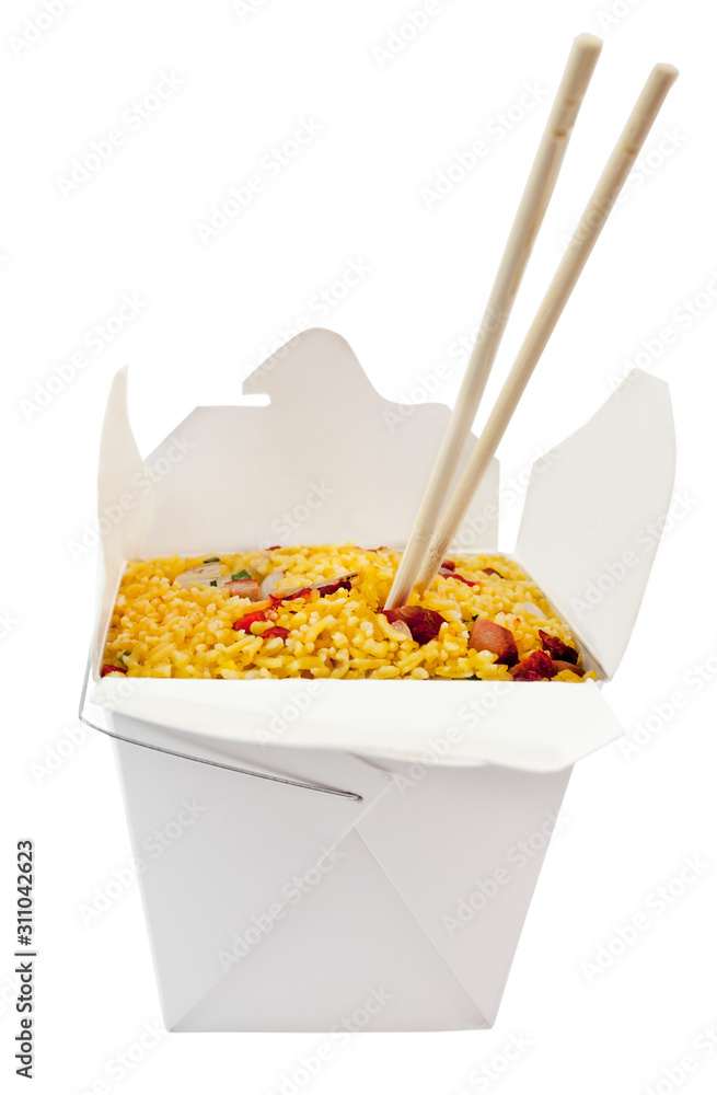 Isolated carton of Chinese pork fried rice with chopsticks.