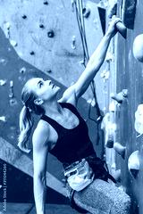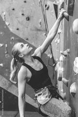 Sportswoman climber moving up on steep rock, climbing on artificial wall indoors. Extreme sports and bouldering concept