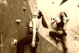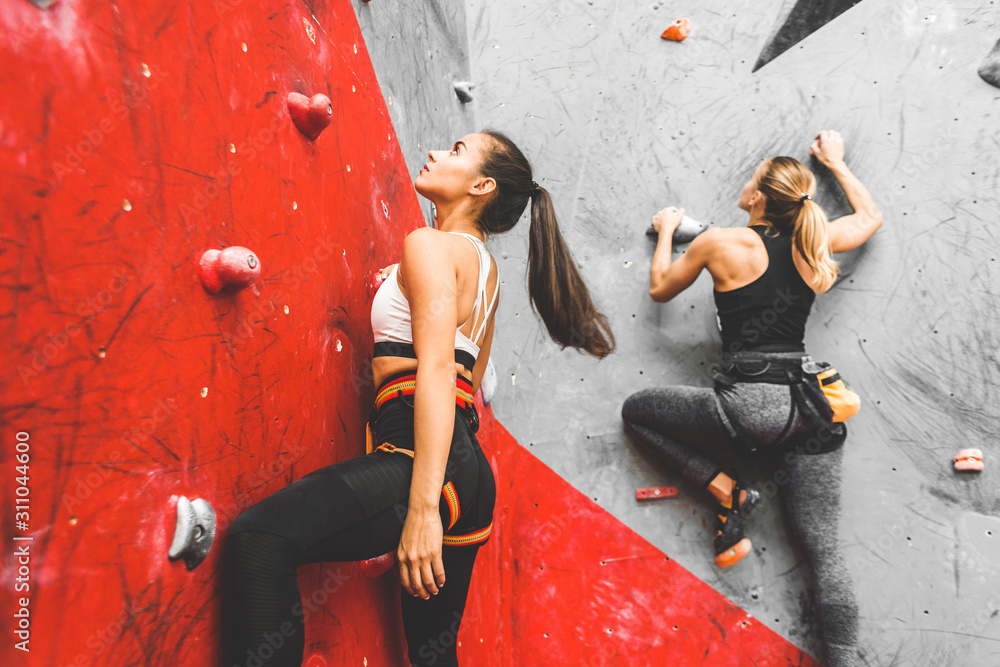 Athletes climber moving up on steep rock, climbing on artificial wall indoors. Extreme sports and bouldering concept