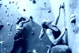 Athletes climber moving up on steep rock, climbing on artificial wall indoors. Extreme sports and bouldering concept