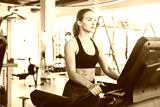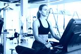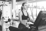 The athletic woman dressed in a black sportswear running on the treadmill in the modern gym