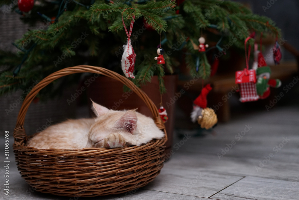 the lazy maine coon cat lies in a wicker basket under the Christmas tree