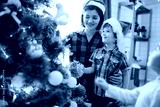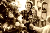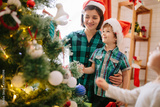 Happy family mom, son and daughter on a Christmas winter sunny morning in a decorated Christmas celebration room with a Xmas tree and gifts.