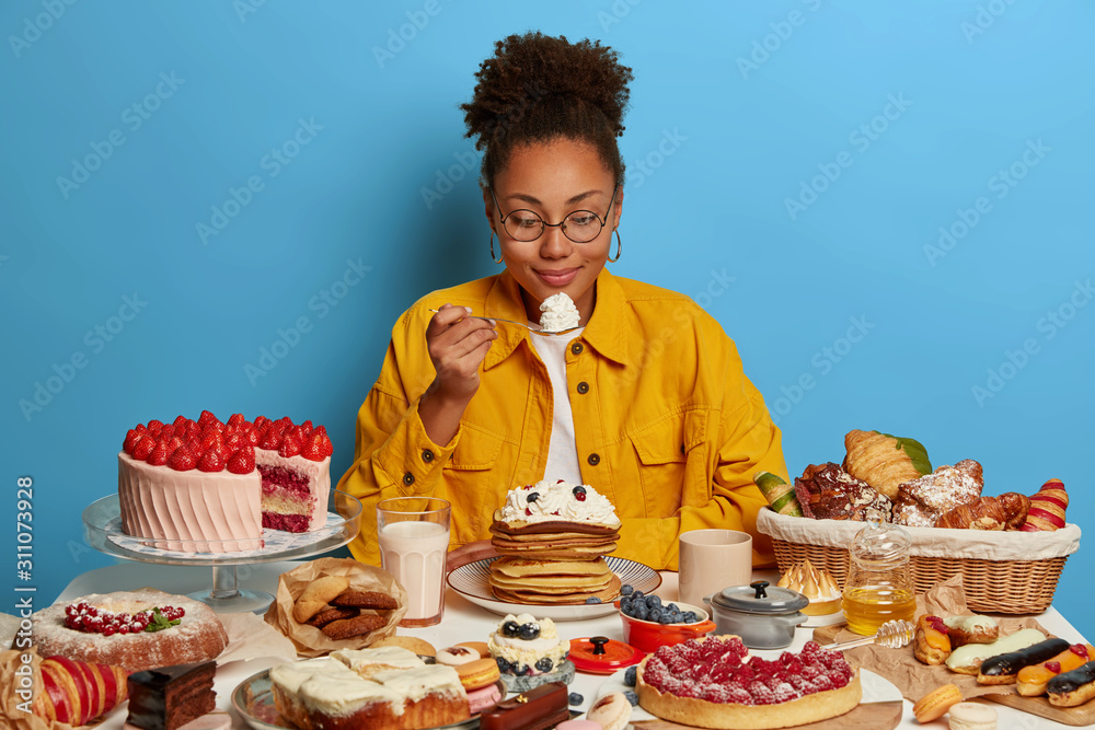 Ethnic sweet tooth holds spoon with cream, enjoys eating tasty dessert, poses at table with desserts, bakes tasty pancakes, wears round spectacles and yellow shirt, has good appetite, isolated on blue