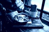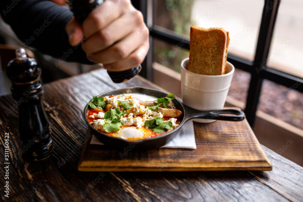 Shakshuka with eggs, tomatoes and parsley in a pan. Shakshuka is a traditional Israeli tomato stew with an egg. Fried eggs with sausages. Little frying pan with food on a wooden board. Wooden table