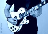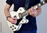 Man playing a white electric guitar with humbucker pickups.